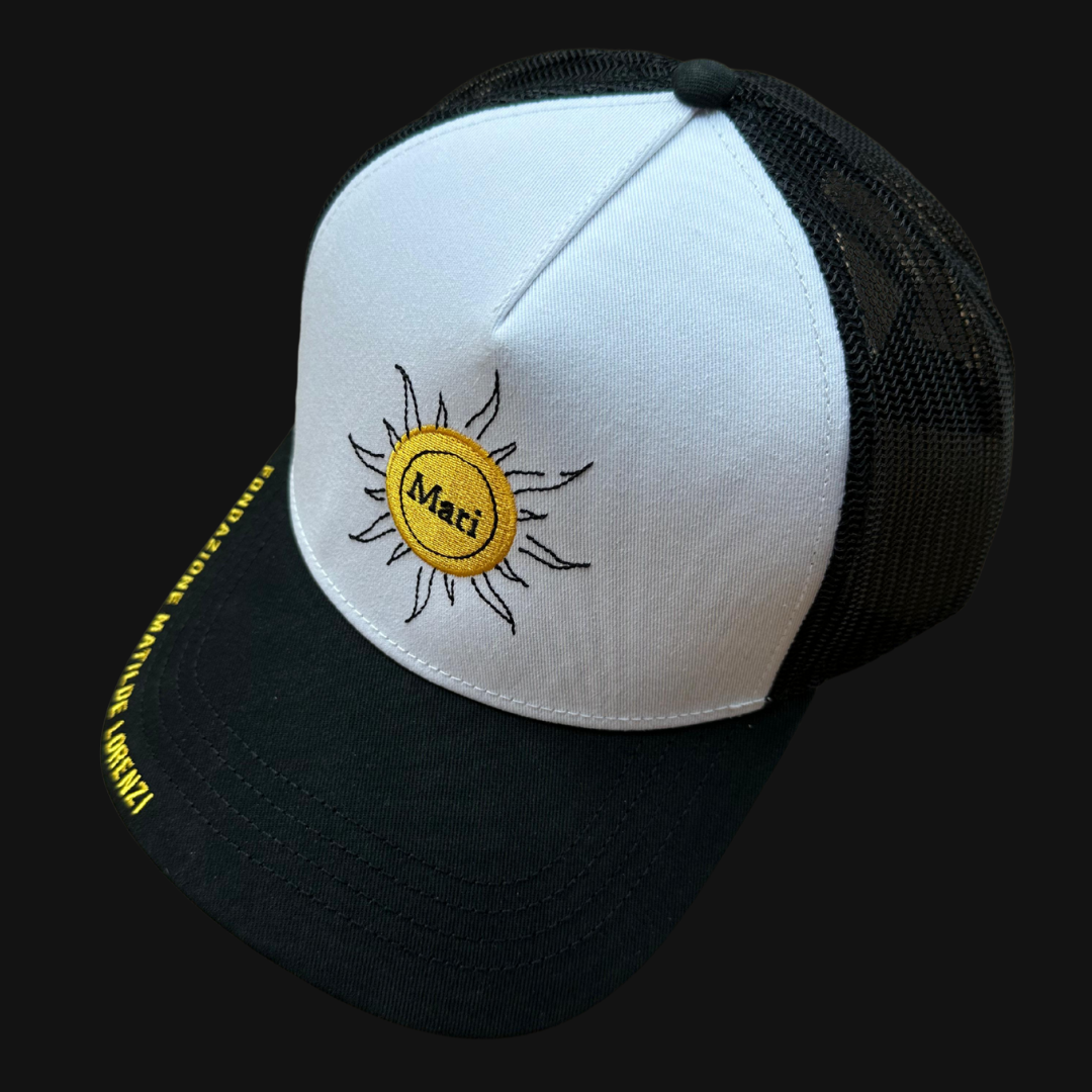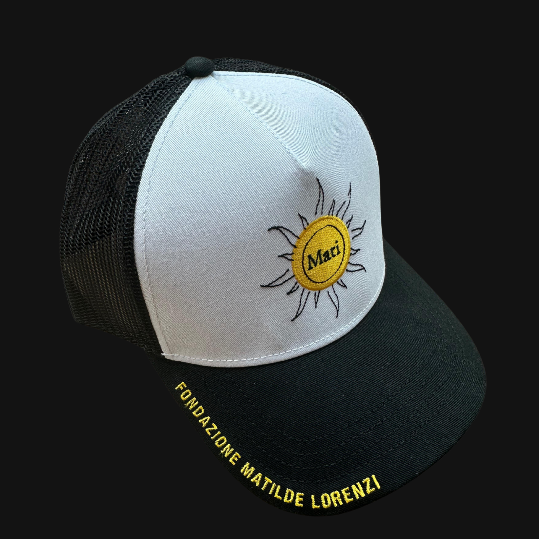Con visiera nera, pannello frontale bianco e retro in rete traspirante, presenta il logo della Fondazione con la scritta “Mati” ricamato sul fronte e la dicitura “FONDAZIONE MATILDE LORENZI” in giallo sulla visiera.