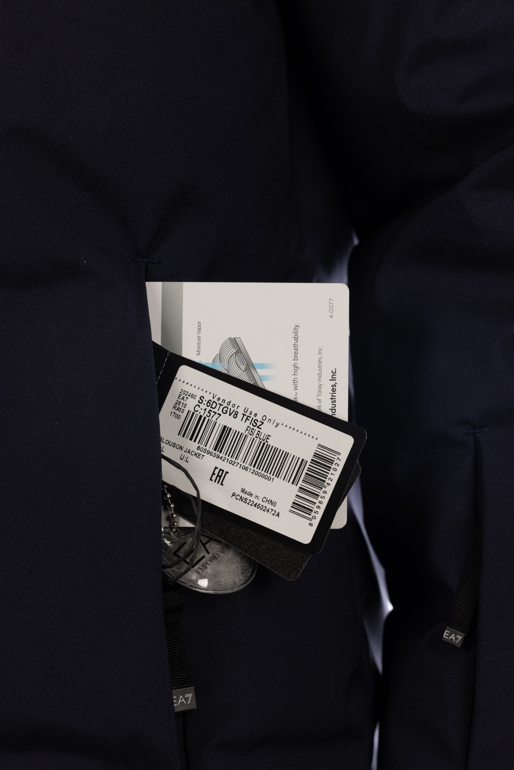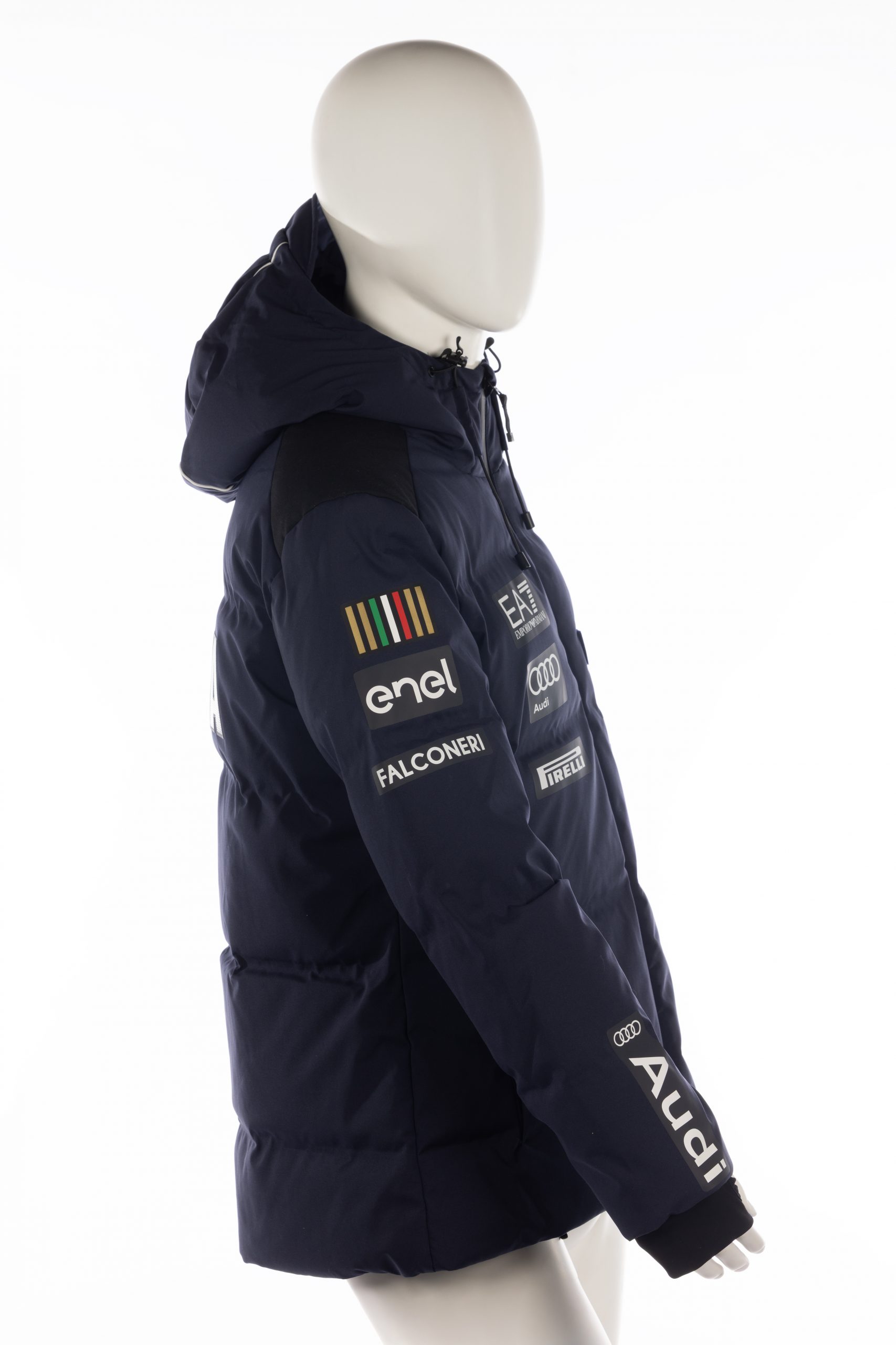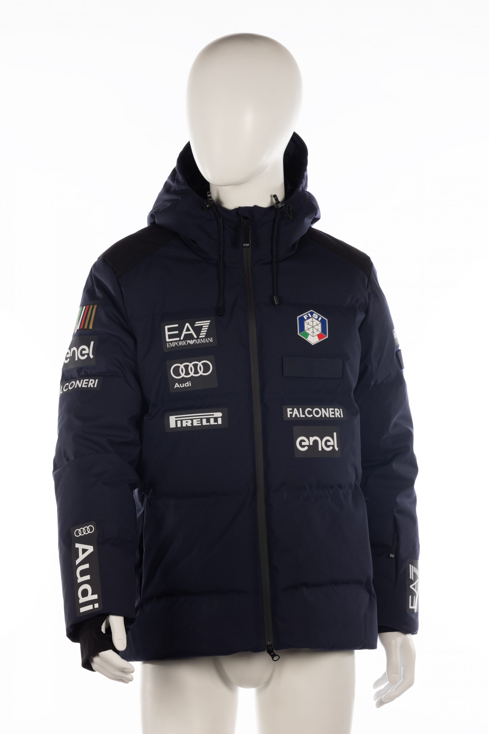 Giacca piumino nuova EA7 FISI di Matilde Lorenzi, stagione 2024/2025, colore blu scuro, taglia L.