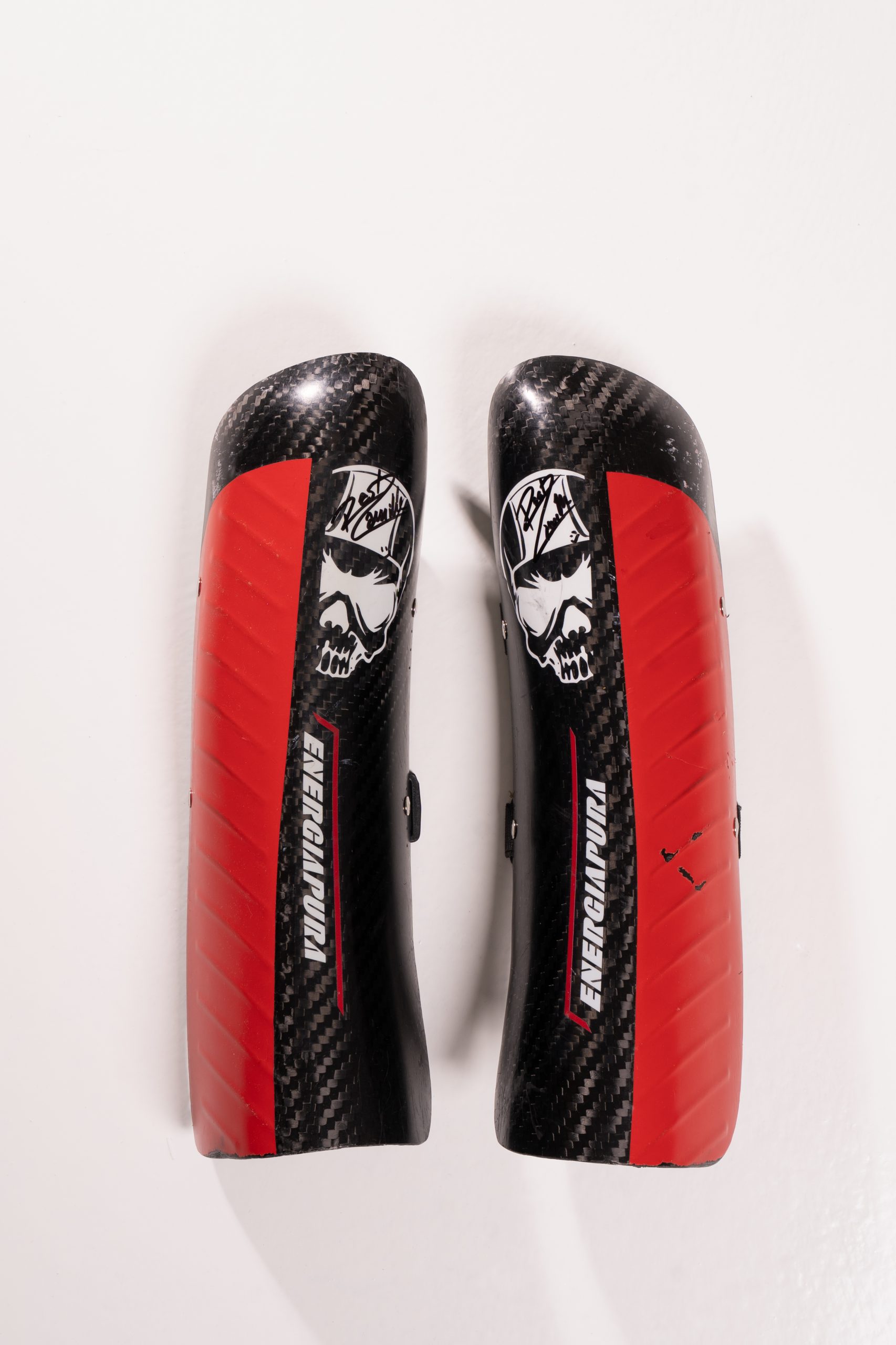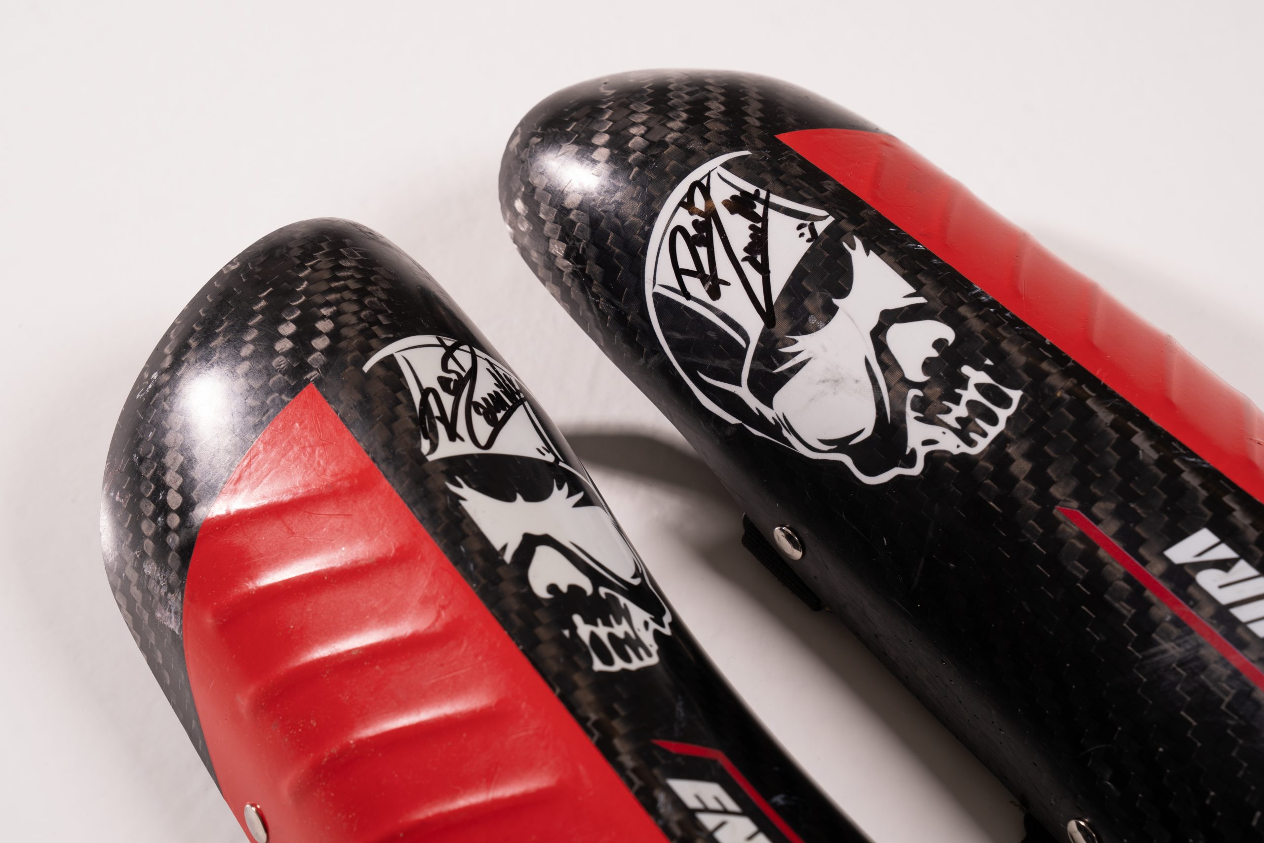 Due parastinchi indossati e firmati da Camille Rast, l’atleta svizzera che ha conquistato la medaglia d’oro nello slalom ai Campionati Mondiali 2025 a Saalbach-Hinterglemm.